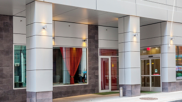 With tourism flourishing in Lower Manhattan, the well-appointed budget hotel was designed to meet current market demands while maximizing the floor and area ratio and the number of guest rooms. To achieve the design intent, increase the size of the guest rooms and maintain the project on budget, the façade composition was redesigned from an original of concrete masonry units and masonry to one featuring a much more slender exterior wall clad in Reynobond® 4mm FR Composite Material over an engineered dry-seal gasket system with metal stud framing.